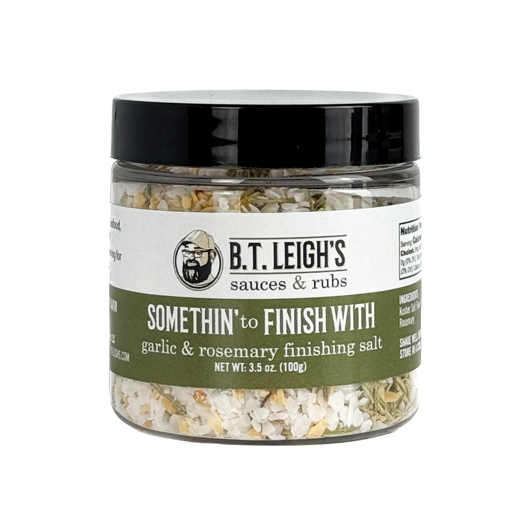 Bring a flourish of flavor and texture to your plate with B.T. Leigh's Somethin’ To Finish With, our handcrafted finishing salts that will take your dishes from great to unforgettable. Each blend pairs premium kosher flake salt with bold spices and herbs for the perfect last-minute touch.