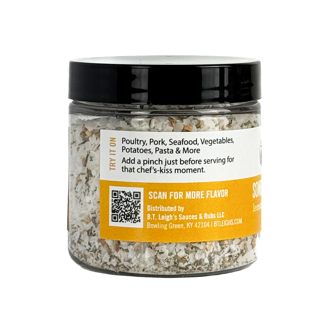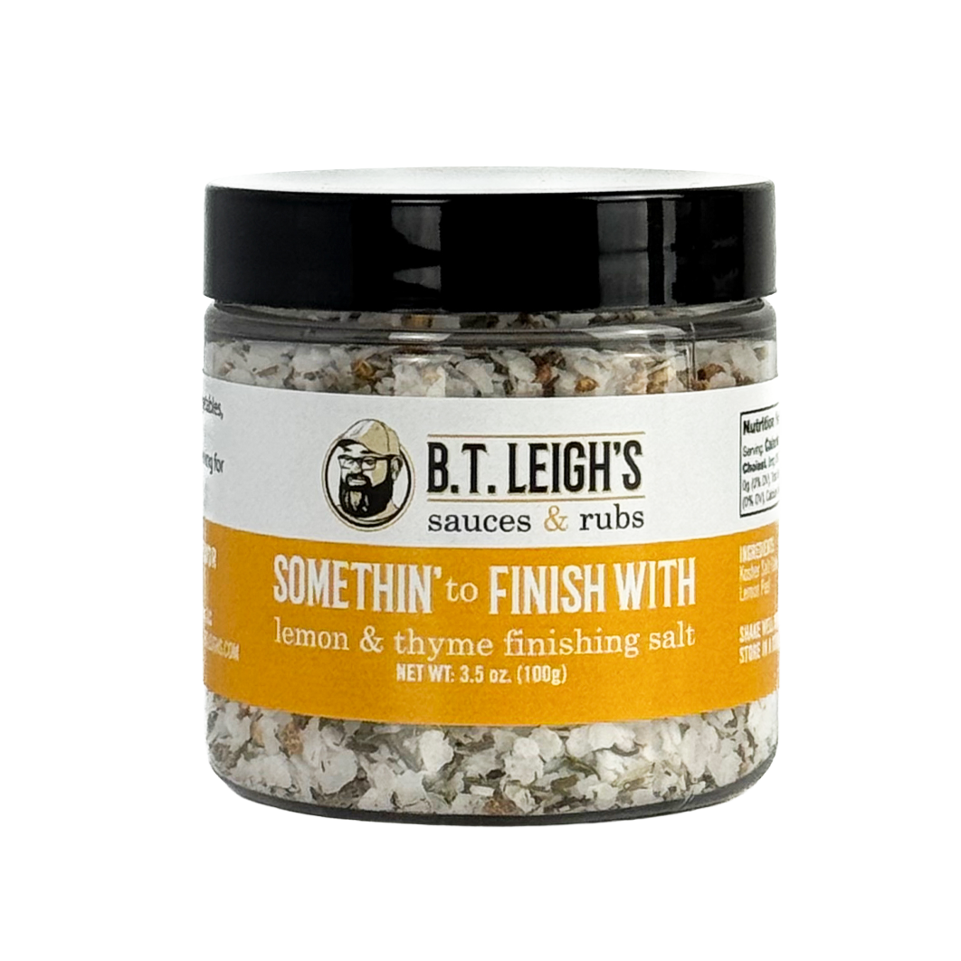 Bring a flourish of flavor and texture to your plate with B.T. Leigh's Somethin’ To Finish With, our handcrafted finishing salts that will take your dishes from great to unforgettable. Each blend pairs premium kosher flake salt with bold spices and herbs for the perfect last-minute touch.